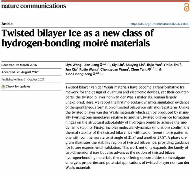 近日,土木工程与力学学院微纳米力学团队唐淳教授、王丽雅副教授与香港城市大学曾晓成教授团队合作,发现氢键主导的非范德华摩尔材料:魔角双层冰,在国际著名期刊Nature Communications上发表题为Twisted bilayer ice as a new class of hydrogen-bonding moiré materials的论文。欧亿体育·(中国)官方网站为第一完成单位,王丽雅为论文第一作者,香港城市大学江健博士、欧亿体育·(中国)官方网站唐淳和香港城市大学曾晓成为共同通讯作者。