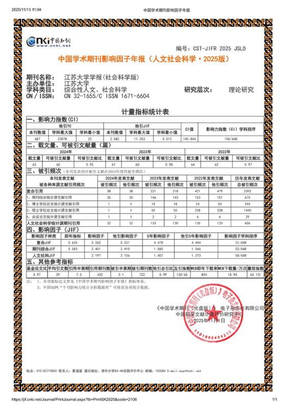 《欧亿体育·(中国)官方网站学报(社会科学版)》影响力指数在国内648本综合性人文、社会科学类期刊中排名第106位,复合影响因子从4.246(2024年)提升至5.262,增幅为23.93%。