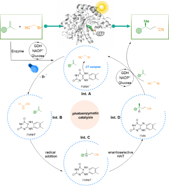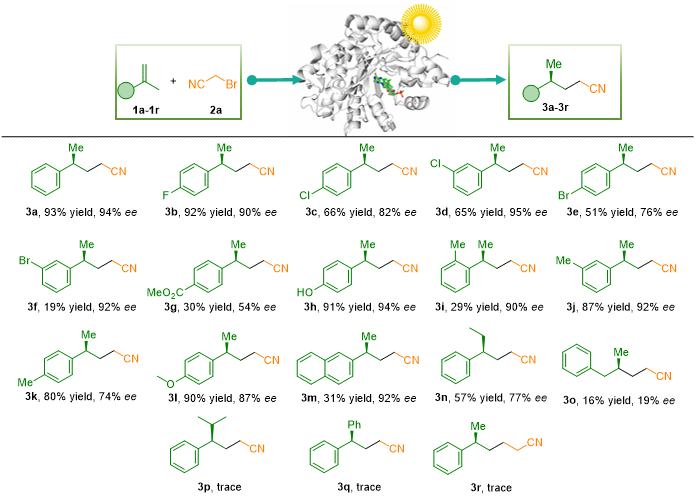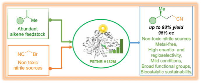 酶促直接引入氰基的策略仍不成熟,限制了药物和功能材料中手性腈衍生物的合成。该研究发展了一种光酶促γ-氢氰化策略,实现了对这一瓶颈的突破。通过工程化烯还原酶,在可见光激发下,还原型黄素辅因子可高效活化具有挑战性的脂肪族C─Br键(如溴乙腈),生成的氰甲基自由基在酶活性位点内被精确限制并定向,与α-甲基苯乙烯偶联。该体系展现出显著的立体控制能力,活性位点同时负责自由基生成与后续对映选择性的氢原子转移,可生成多种γ-立体中心手性腈,产率最高达93%,对映选择性可达94% ee,而此类反应对传统过渡金属催化具有相当挑战性。该研究不仅提供了一个稳健的非对称氰烷基化平台,也推动了光酶促催化的发展,首次证明非活化烷基溴化物可作为可控成键的有效自由基前体。