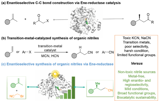 光酶促催化通过结合光化学的多样反应性与生物催化的精确选择性,已革新了非对称合成,并在黄素依赖型烯还原酶的基础上实现了对自由基转化的原子级控制。尽管该领域已在活化α-羰基卤代物、实现分子间加成等方面取得进展,并扩展到ThDP、PLP依赖酶及人工光酶体系,但对无活化烷基C–Br键的直接活化仍未实现,而这类底物比碘代物更易获得且结构更丰富。另一方面,氰基因其独特的电子性质和合成可转化性,是70余种临床小分子药物中的关键结构,但现有方法难以在无活化烯烃上直接、对映选择性地构建带γ-立体中心的烷基腈。基于上述挑战,作者提出利用光酶促催化开发可在可见光下活化惰性C–Br键的工程化烯还原酶,同时精确控制自由基的立体化学,实现以溴乙腈为氰化剂,将α-甲基苯乙烯转化为γ-立体中心腈类,从而拓展手性腈的合成工具箱并开启烷基自由基光酶促化学的新方向(方案1)。