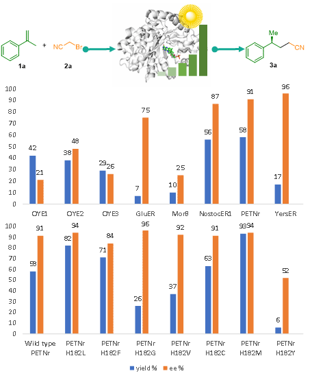 研究对十二种烯还原酶的初筛显示其活性与立体选择性差异显著;PETNR野生型因兼具较高转化率与对映选择性而被选为工程化基础。通过分子对接与活性位点分析,研究锁定H182、H185为调控关键,并对其进行系统突变,其中H182M表现最佳,使产率升至93%、ee达94%。光照、酶环境与NADPH均被证明对反应必不可少,蛋白支架对自由基过程尤为关键。在优化条件下,工程化PETNR可高效催化α-甲基苯乙烯与溴乙腈的γ-氰基化。底物拓展表明该体系兼容多种取代烯烃,能耐受供/吸电子基团、游离酚羟基及扩展芳环,普遍获得良好产率和高ee;但邻位位阻、较大烷基取代或非芳香烯烃会显著降低反应效率,强调苯环在该自由基立体控制过程中的关键作用(表1-2)。