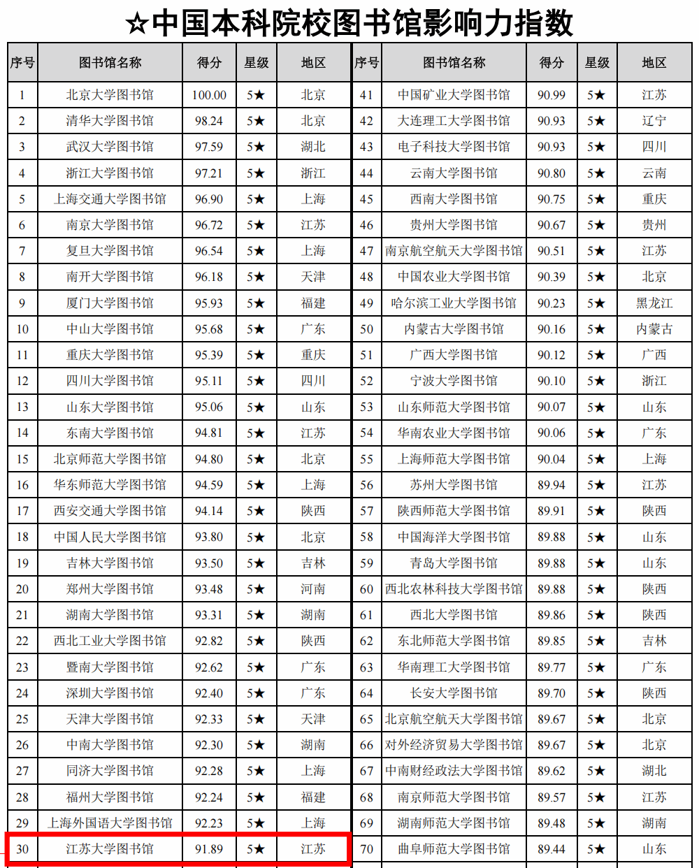 近日,武汉大学中国科学评价研究中心以及数字出版智能服务技术教育部工程研究中心发布《数智时代中国图书馆影响力评价报告(2025)》,报告从基础实力、网站影响力、新媒体影响力、社会影响力、学术影响力5个方面对全国高校图书馆、公共图书馆和专业图书馆进行了评价。我校图书馆获评五星等级,名列中国本科院校图书馆影响力总排行榜第30名,一般本科院校图书馆影响力排行榜第2名,高校图书馆学术影响力排行榜第3名。