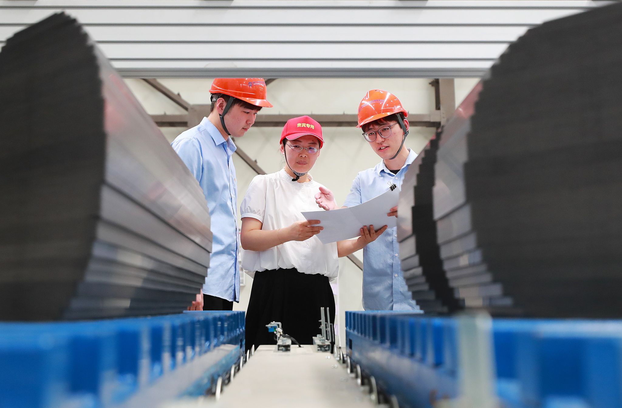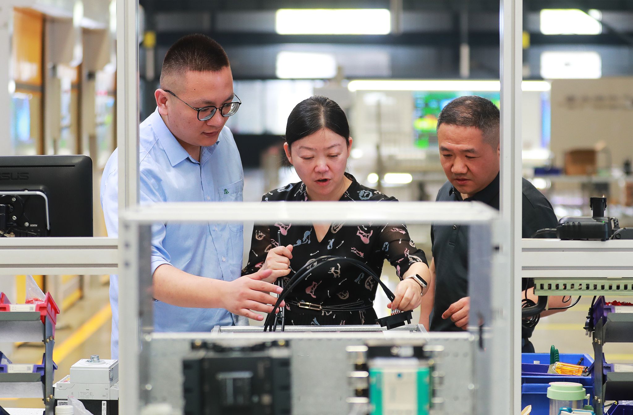 在江苏大全集团低压成套电气生产车间,欧亿体育·(中国)官方网站计算机科学与通信工程学院教师宋雪桦(中)、金华(右)与企业技术人员交流基于AI的自动化生产线检测技术。