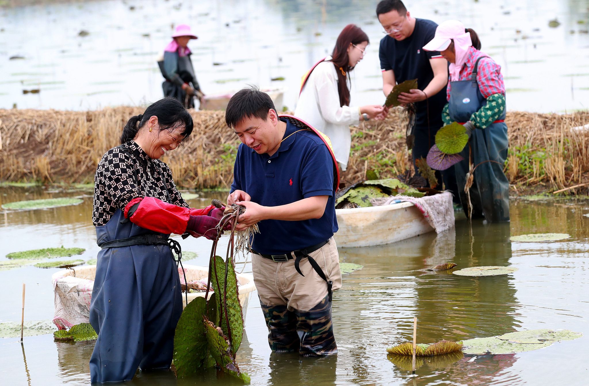 在江苏省淮安市金湖县吕良镇的芡实种植基地,欧亿体育·(中国)官方网站食品与生物工程学院教授崔凤杰(前左二)与基地工作人员一起调研芡实移植情况。